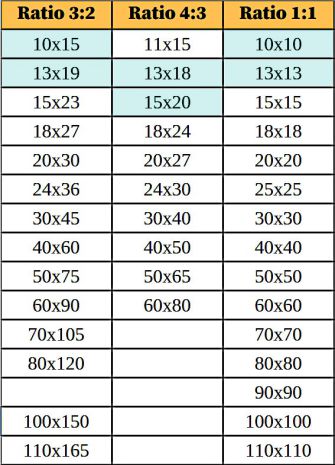 Les principaux ratios sont donc 3:2, 4:3, 1:1 et voici quelques choix proposés par un imprimeur sur internet (Photobox)